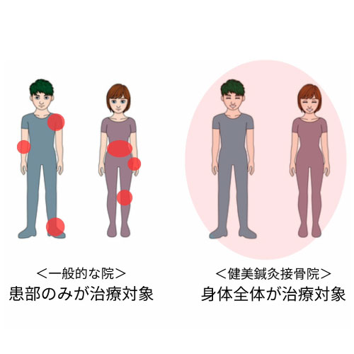 人間は知らない間に、身体の感覚と実際の行動に不一致がでてきます。感覚と行動の不一致は、脳に悪影響を与えます。そして、不一致の積み重なりが不調の原因に。健美鍼灸接骨院では、自分の感覚ではなく、施術者と一緒に脳と身体の感覚を養っていくことで、身体本来の良い状態を目指します。